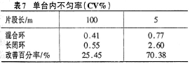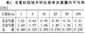 总延迟时间τO′=τ1-τ2,如τ1>τ2,则在电路中增加一个延时τ3,使τ0′=τ1-(τ2+τ3)=0,各种波长(长、中、短波)的振幅都能得到匀整,因此各种片段不匀率(长、中、短片段不匀率)都能改善。但牵伸区的牵伸又增加了牵伸波,在一定程度上破坏了短片段不匀率。表6为机前短开环的单台内不匀率。