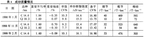 表l、表2数据均为月平均值,从表中可以看出,成纱均匀度、单强CV%值有较大改善,成纱乌斯特条干CV%值、千米细节、千米粗节、千米棉结均达到和接近Uster89公报25%水平。由于成纱质量的提高,使我公司棉纱在国际市场上的竞争能力大大增强,为提高企业效益创造了良好的条件。