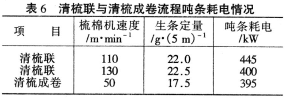 从表中可以看出,清梳联与清梳成卷流程吨条耗电相比,清梳联采用出条速度较低时,吨条耗电大于清梳成卷流程;清梳联出条速度130m/min时,清