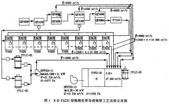 (3)如果一套清梳联流程中,各类排、吸风量之总和大于45000m3/h(细号纱、化纤混纺纱大于60000m3/h),则开清棉和梳棉应各设1套除尘机组(共用2套)或更多。