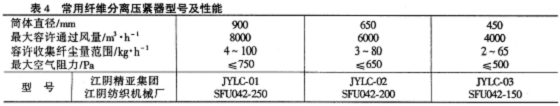 (3)凡是收集各类纤尘和落棉的纤维分离压紧器,必须根据其所负担的主机数量、单产和落棉率计算进入器内的纤尘落棉量(以kg/h为单位),并算出经过器内的最大风量,据此选择纤维分离压紧器的型号。务必使纤尘落棉量和风量两个方面均略小于该器的额定值,这在设计大风量连续吸梳棉机和各类连续吸落棉的除尘系统中,尤应注意。常用的纤维分离压紧器型号性能见表4。