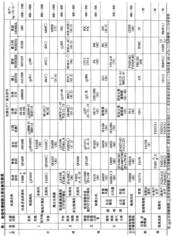 目前常用各种型号清梳联流程中主要设备分类与性能如表1所示。
