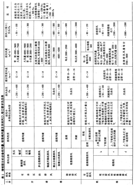 ②生产纯棉细号纱和化纤混纺纱,开清棉流程中应设置各类打击点2个~3个,如生产特细号精梳纱,还要在流程出口段增设除微尘机。2清梳联主机排风分类及吸口负压要求清梳联流程中,各主机设备的性能、功用和产量各不相同,其排风量、吸落棉风量及其排风口、吸口要求的负压都不一样,见表2所示。