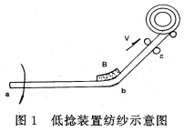 根据用户要求,T/C50/5058.7tex0E纱捻度较低,纱线要求起绒,所以我们在纺纱器配置时,采用S型(φ48mm)纺杯,OK61型分梳辊及八槽金属假捻盘的配置,为降低断头率和提高成纱质量,我们采用低捻装置。低捻装置原理简介参见图1。