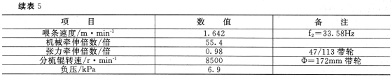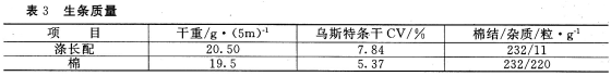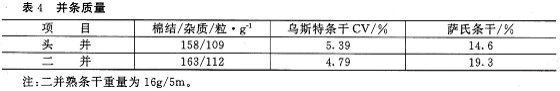 由于涤长配及棉生条短绒较多,因此在保证清梳半制品质量的前提下,在并条机上放大后区隔距及后区牵伸倍数,并减轻条重,以利于牵伸。并条质量检测结果见表4。
