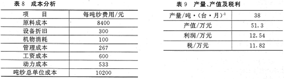 按当时市场计价,该厂所购涤小化纤单价为7800元/吨,所购原棉623单价为11000元/吨,再加上环锭纺所产生的回条、回花及部分下脚,综合折算原料成本价为10200元/吨左右,T/C50/5058.7texOE纱现市场售价为1.3万元/吨,单台机每天产量1.3吨左右,四台车同时生产该产品,效益极其可观,成本分析见表8。利润情况见表9。