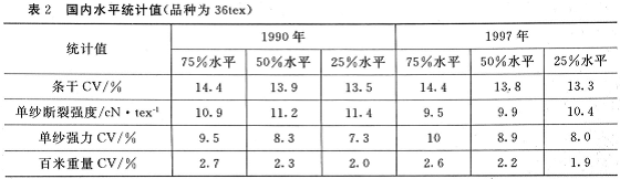 中国棉纺织行业协会和国家棉纺织产品质量监督检验中心于1990年和1997年也分别编制了1990年和1997年国内纱线质量水平统计值,见表2。表2为转杯纱36tex质量水平。
