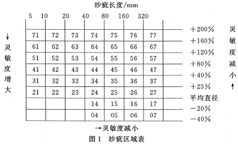 图1为清纱器的纱疵界限参数表。方框中的数值表示纱疵的区域,例如53号纱疵区域表示纱疵的长度为20mm040mm,纱疵的直径要比平均直径粗80%~120%。在清纱器上输入纱疵区域参数后,对于粗节来说,该区域右边及上边等纱疵区域将被清除,而对于细节来讲,该区域的下边及右边将被清除。