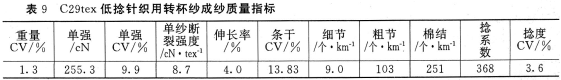 当我们的客户得悉BT903型机已投入运行的时候,他们立即要求配合开发低捻度的29tex针织用纱。当配棉(品级229)、工艺设定上机后,出现的最大问题是BT903型机断头太多。经咨询应该更换带螺旋的R7RS型阻捻头和带定捻器的引纱管。技术人员根据这一原理,找出报废的(表面已经磨成螺旋式)钢件R7型阻捻头,上机后效果明显。经测试条干CV为13.35%(5%水平),细节3.5个/km(25%水平),粗节61.5个/km(25%~50%水平),棉结196个/km。该品种一共生产了45吨,售价2万元/吨,经济效益可观。各项试验指标(22次)平均值见表9。