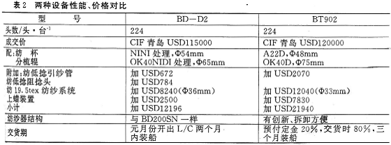 根据我公司的经济实力,前纺设备的配置及客户定位,经研究宜选择中速。即优选BASEtex公司的BT902型和捷克Elitex公司的BD—D2型。根据两家公司提供的设备资料,技术、性能和价格对比情况见表2。