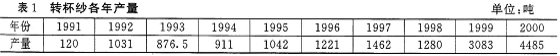 我公司原有环锭纺4万锭,转杯纺600头。为了落实三年时间淘汰1000万枚落后纱锭的国家政策,我公司于1998年12月砸掉1万枚纱锭。剩下的清梳、并粗、络筒及附属设备如何处置,我公司经过对市场充分调研,认为:(1)我国拥有棉纺4600万纱锭,转杯纺61万头。压缩1000万锭后,转杯纺的头数占环锭纺约1.7%,而全世界共拥有转杯纺729万头(统计1995年底止)占环锭约4.7%。可见,我国的比例与世界相比,尚有一定的差距;(2)2001年我国加入WTO,这给劳动密集型的中国棉纺行业带来机遇和挑战。与国际接轨,参与国内外市场竞争是经营决策者投资的基本点;(3)转杯纱适用于牛仔服装,穿着舒适、潇洒。流行全世界,男女老少皆宜。牛仔服装有重磅、中磅、薄型、超薄型。根据不同季节织造厂大量需求不同号数106tex~18tex、不同品种的OE纱。因此,市场前景看好,可以说长久不衰;(4)根据我公司多年来纯棉()E纱生产经营情况看(见表1),OE纱的产量逐年提高,销售稳定,经济效益可观。