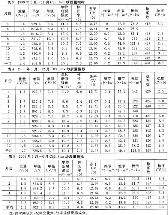 投产以来不同时期生产C83.3tex纱的成纱质量指标分别见表3、表4、表5。