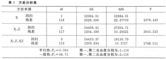 查表得F0.05(1,116)=3.92>Fp=0.093,因此没有理由拒绝两种测试方法回归线的平行性假设,即两支回归线之间存在明显差异,且这种差异是稳定的。