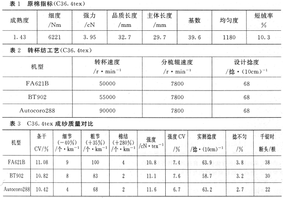 以3.5级配棉纺OE36.4tex纱为例,原棉配棉指标见表1,转杯纺工艺见表2,三种机型纺纱质量对比见表3。