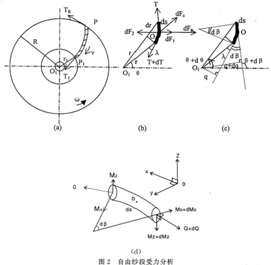 如图2(a)所示,取剥离点P及假捻盘入口P1点之间的自由纱段为研究对象。其中,r1为假捻盘外半径,T1和TR分别表示自由纱段两端张力,转杯轴心线垂直于纸面通过01点。如图2(d)所示,在该自由纱段上取含O点的微元纱段ds,并建立直角坐标系O-xyz,其中Oxyr为微元纱段ds所在的平面,x轴沿着微元纱段ds的切线方向,y轴沿着微元纱段ds的主法线方向,z轴沿着微元纱段ds的副法线方向。另外,以极坐标(θ,r)作为自由纱段的曲线轨迹坐标,θ为纱条在转杯内任意点处的极角,r为自由纱段上任意点的极径,如图2(b)所示。在图2(c)中,入为自由纱段任意点切线与转杯径向之间的夹角,dβ为微元纱段ds对曲率中心的包角,q为转杯轴心线到自由纱段曲线上任意点切线的垂距。