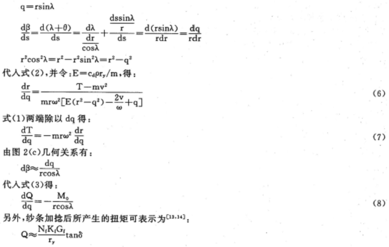 转杯纱机械捻度为什么比相应的环锭纱高?自由纱段和剥离点附近纱条上到底有多少捻度?转杯纺杯内纱条的捻度究竟是如何分布的?过去研究工作[1-3]认为:引纱孔内一段纱条上是机械捻度,假捻盘上一段纱条中是机械捻度加上逐渐增加的假捻捻度,自由纱段上是机械捻度和假捻盘所施加最大假捻捻度之和,且一直保持到剥离点附近纱条上。既然剥离点纱条捻度是杯内纱条最高捻度(机械捻度+假捻捻度),即使在向凝聚槽内须条传递捻度过程中会受凝聚槽壁的部分阻力矩,但转杯纱机械捻度和环锭纱机械捻度不应相差很多。