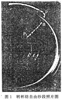 尽管有研究工作者[2]计算过自由纱段上的捻度分布,但未将自由纱段的弯曲[4-5]对捻度分布的影响考虑在内,因此认为杯内自由纱段的捻度分布是均匀的。根据有关文献资料[6-9]以及Singh[10]所拍的自由纱段图片看(见图1),自由纱段曲线形状对加捻区域纱条的捻度分布是有影响的。由图1可以看出,剥离点附近自由纱段(图1中PB段)和假捻盘附近自由纱段(图1中BP1段)捻度相差比较大,这说明自由