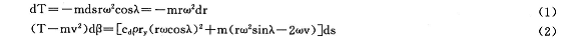 微元纱段ds上所受的力有:两端作用有张力T和T+dT,沿着微元纱段ds两端的切线方向;微元纱段随纱条绕转杯轴心线回转而产生的牵连运动惯性力为dFc=mrω2ds,方向沿着转杯径向,式中m为纱条线密度;空气阻力dFa=cdρry(rωcosλ)2ds[11],方向沿着微元纱段主法线,式中cd为空气阻力系数,ρ为空气密度,ry为纱条半