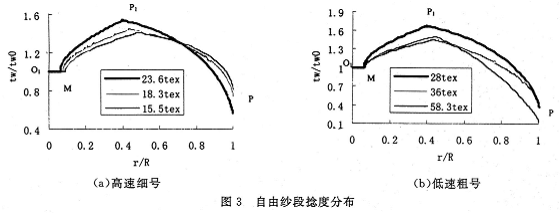 上述分析表明,转杯纺纱加捻点处产生的真捻捻度和假捻盘上产生的假捻捻度在自由纱段上的传递过程中,因自由纱段存在的弯曲会减少一部分加捻扭矩,用于克服纱线的抗弯力矩Mo,使得自由纱段捻度呈“捻陷性”分布。假定成纱捻度为two,杯内任意点纱条捻度为tw,则可用tw/two。来表示自由纱段上的