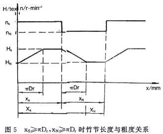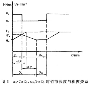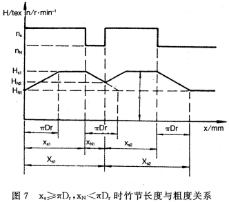 上述有关竹节长度、基纱长度计算公式可作为竹节参数设置的依据,但是它们之问的不同组合将会产生不同粗度和形态的竹节,以下分三种情况予以讨论。为讨论方便,不考虑伺服升降速过程,并假定竹节设置粗度不变。