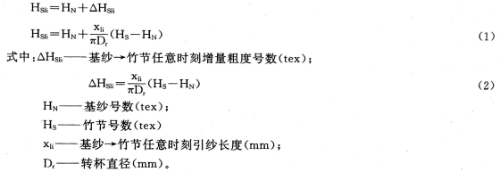 即在基纱一竹节渐变过程中,竹节粗度是原基纱粗度与增量粗度之和。增量粗度△Hsli随着引纱长度Xli的增加而增大,当Xli=πDr,即一个转杯周长时,竹节粗度Hsli达最大值Hs,即基纱一竹节转换结束,进入竹节粗度值纺纱。而增量粗度△Hsli正比于(Hs—HN),表明竹节与基纱的倍数越大,增量粗度增加越快。