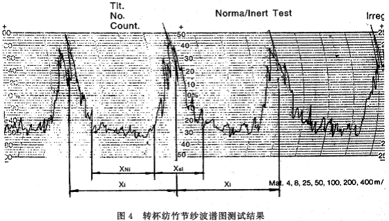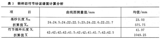 表3为上述纺纱品种与条件下,基纱设置长度840mm,竹节设置长度210mm一只竹节循环竹节纱,用乌斯特曲线图测量法(见图4)所测得的实际基纱长度XNi和循环长度Xi值。