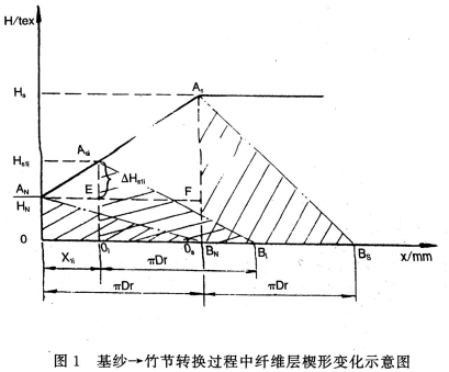 纺制竹节纱时,由于转杯转速没有变化,转杯凝聚槽内铺设的纤维层数不变,细纱截面内纤维数的增加是靠给棉伺服电机的增速,以加大给棉量增加每层纤维束内的纤维量来实现的。给棉伺服瞬间加速后,虽使给棉输出达到纺制竹节所需的纤维量,但由于输入的新增量纤维束还是要逐层叠加铺设,并在转杯全周长内排列分布,故纱线的增粗是在转杯全周长范围内同时发生。由于纺纱是个连续的动态过程,在新增量纤维输入使细纱增粗的同时,成纱亦在不断地引出,故在从基纱一竹节转换的初始阶段,被剥离纤维层内累积的增量纤维十分有限,纱截面内纤维数量增加不多,竹节效果不明显。随着纺纱过程的延续,随后不断被剥离的纤维层内累积的增量纤维数逐渐增多,竹节也逐渐变粗,直至基纱一竹节转换过程的结束,才连续纺出所设置粗度的竹节。由于转杯内原纺基纱时滞留的相对低量纤维