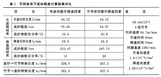 表2是根据以上推导公式,对纺58.3tex(10s)4倍竹节纱,引纱速度64.7m/min,伺服升速时间40ms,降速时间50ms时,计算得出的伺服升降速结束时成纱粗度与不考虑伺服升降速因素成纱粗度的对比结果。由表2可见,因伺服升降速因素的存在,基纱与竹节转换初期成纱粗度变化更为平缓,其基纱与竹节转换长度都有所延长。