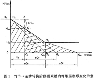 同理,从图2竹节一基纱转换阶段凝聚槽内纤维层楔形变化,