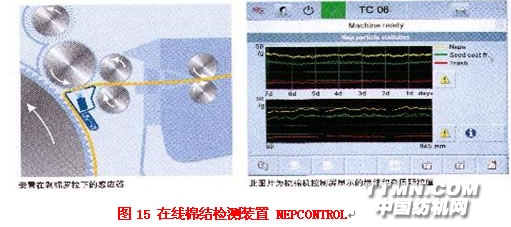 3、图14为通过除尘刀的设定系统可优化设定除尘刀与针布的踞离及喂棉罗拉的握持点与除尘刀的距离,改善棉网的清洁度。这是TC5-1梳棉机的重要特征之一。除尘刀围绕第一预开松罗拉的中心作圆周运动,可在几秒中内进行无级调节。使除尘点与针布之间的距离在任何位置上保持一致(可手动调节)。优化的喂入机构可使梳理负担合理,达到好的梳理效果,充份的减少结