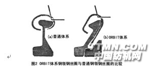 2、瑞士立达公司生产的Hi-per-spin环锭细纱机采用的ORBIT高速钢领钢丝圈是由特殊耐磨材料制成,具有耐磨擦、使用寿命长的特点,而且设计时扩大了钢领钢丝圈的几何尺寸使接触面增加了4-5倍,从而增加了散热能力, 使钢丝圈使用寿命延长,在速度高达25000转/分时毛羽不会增加。还可适当选配较轻的钢丝圈,减少钢丝圈与钢领之间的应力和对细纱的磨擦,从而也减少了毛羽数量。(图5)