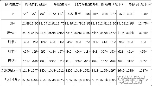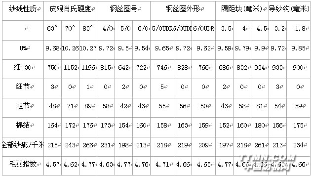 表2、3及4表示钢丝圈重量轻时会使纱线毛羽减少。钢丝圈减轻会使钢丝圈的重心降低,使钢丝圈运转稳定,但。钢丝圈过轻,气圈太大会影响钢丝圈在钢领上正常飞行气圈会与隔纱板碰撞产生毛羽。
