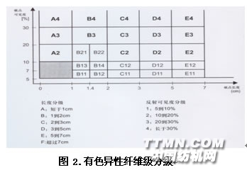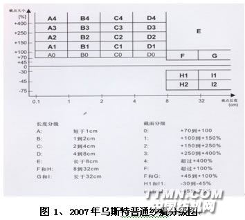 2007年乌斯特纱疵分级图包括一般纱疵分级图及有色异性纤维分级图两种,是在2005年的基础上发展的,主要增加了有色异性纤维分级图,也扩大了对一般纱疵分级的分级的范围