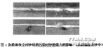 1.杂质和灰尘对纱线的污染:图1及图2表明杂质和灰尘对纱线的污染对纱线质量的影响.不仅影响纱线外观而且会影响纱线的强力. 会产生强力弱环 以转杯纱为例,杂质和灰尘是转杯纱产生强力弱环的一个不可忽视的因素之一.见第五章第8 图所示杂质是转杯纱产生的强力弱环的因素, 杂质约占16%,籽壳屑占7%,图3为纱线中杂质和灰尘含量的波动情况. 应用USTER TENSOJET对大量纱线进行强力测试的结果显示出纱线中的灰尘和籽皮碎片等杂质和灰尘可以引起强力的弱环,如第八章图4所示,对20tex(Nm50,Ne30)纯棉纱转杯纱进行二百万次断裂强力测试,对所发现的69次强力弱环产生的原因进行分类。弱环的平均强力值在7.4cN/tex (最小2.8 cN/tex ,最大9 cN/tex), 平均伸长为3.7%,(最小1.89%,最大6%)。由于转杯纱从内向外加捻的这种特殊的纱线结构,杂质会影响纱线加捻,所以引起强力弱环。