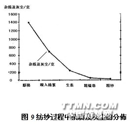 二、在纱线生产过程中,除了获得原棉污染的信息外,了解整个纺纱过程中污染水平的变异也是质量控制中很重要的方面。图9显示了在精梳环锭纱纺前准备过程中杂质含量的变异情况。图9中,在纱线生产的全过程可清晰的看出,许多杂质在梳棉的过程中已被去除,但同时也显示出精梳落棉率对棉纱清洁有很大的影响。