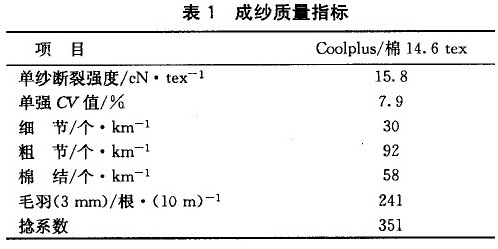 由Coolplus纤维与棉混纺制成的14.6 tex纱,混纺比例为50/50,纱线的具体指标见表1。