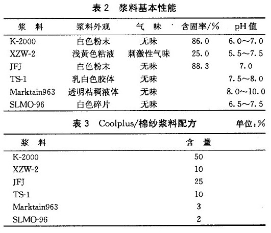 选用多元复合变性淀粉K一2000和丙烯酸类浆料 XZW-2组合作为主浆料,淀粉类浆料JF3和改性羧甲基羟丙基天然高分子材料添加剂TS-1作辅助浆料;同时针对Coolplus纤维导电性差,易产生静电,再加入非离子型抗静电剂Marktain963和平滑剂SLMO-96油剂。所选浆料的基本性能见表2。经大量试验和优化设计,得出最佳浆料配比见表3