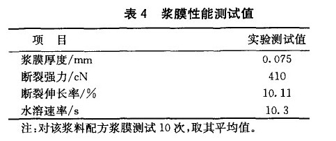 从表4中可看出,浆膜成膜性好,有一定的柔韧性,水溶时间短,可满足经纱上机