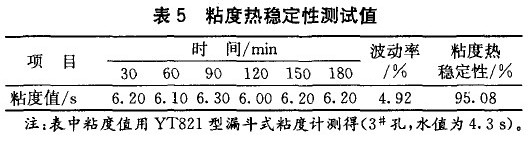 按浆料配方调制浓度为6 的浆液,进行粘度及粘度热稳定性测定,测试值见表5。