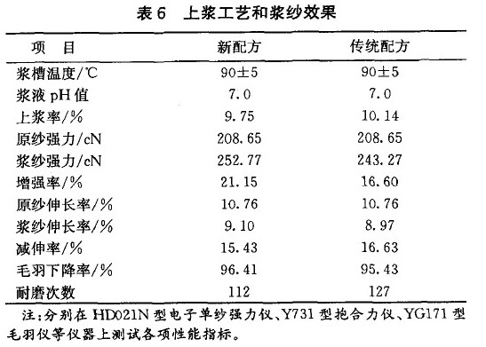 将本试验采用的新浆料配方与含PVA的传统配方作直观试验对比。传统浆料配方为PVA-1799 6O%,醋酸酯淀粉35% ,抗静电剂3% ,油脂1% ,柔软剂l %;两种配方的上浆工艺参数和浆纱性能指标见表6。