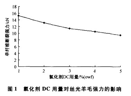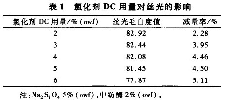 由表1及图1可知,氯化剂DC用量大,丝光毛白度、强力都降低,5% 一6% (owf)的用量足以满足丝光要求。