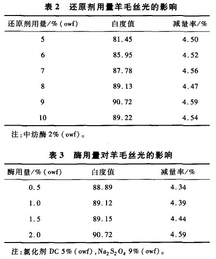采用氯化剂DC用量5%(owf),不同还原剂用量时,按上述步骤处理纤维,结果见表2。酶用量对羊毛丝光的影响见表3。