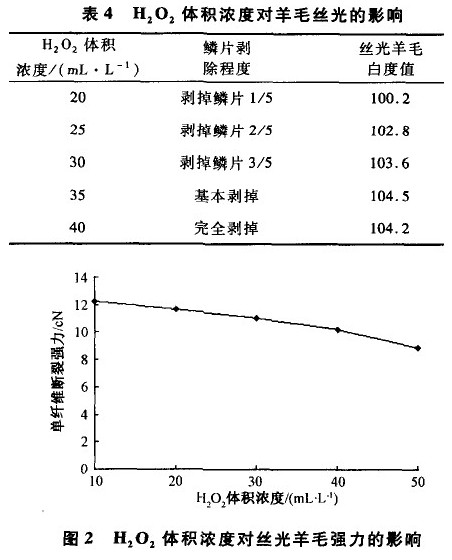 中纺酶CTB—B 0.5%(owf),按上述步骤处理,H2O2 体积浓度对羊毛丝光的影响见表4及图2。