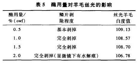 取H2O2 35 mL/L,按上述步骤处理,不同酶用量对羊毛丝光的影响见表5。
