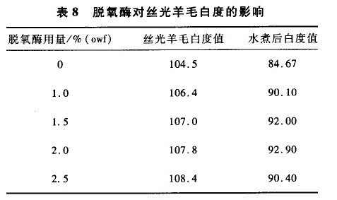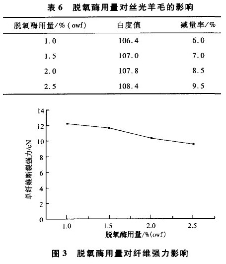 由表6及图3可知,脱氧酶是一种氧化还原酶,在分解H202的同时,提高丝光羊毛的白度,但是对强力稍有降低,其用量1.5%(owf)较为理想。