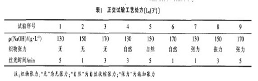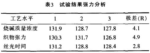 1.3.1.1 影响亚麻织物丝光强力的主要因素通过极差分析.影响亚麻织物丝光强力的因素顺序是:丝光张力>烧碱质量浓度>丝光时间(极差数值分别为:4.9、4.1、2.8)。