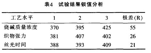 (1)通过极差分析.影响丝光亚麻织物的吸附性能的因素顺序是:烧碱质量浓度>丝光张力>丝光时间(极差数值分别为:55、26、21)。