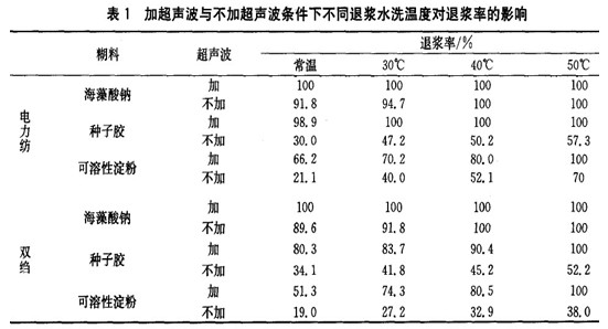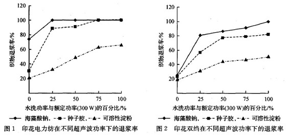 从表l可以看出,以海藻酸钠作糊料的印花电力纺,退浆率若要达到100% ,在超声波条件下常温即可,而常规水洗则需要升温到4O℃;以种子胶作糊料的印花电力纺在超声波30℃条件下退浆率可达100 %,而常规水洗升温到5O℃退浆率仍为57.3 ;以可溶性淀粉作糊料的印花电力纺,在超声波50℃条件下退浆率可达100 %,常规水洗50℃退浆率仅70% (在超声波30℃条件下即可达到退浆率7O% )。印花双绉退浆水洗与印花电力纺情况类似,在此不作重复分析。