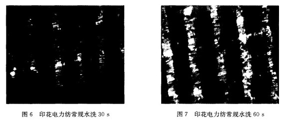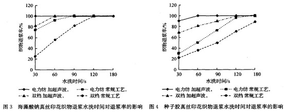 比较3种糊料两种面料印花织物的退浆水洗,其结果显示:超声波水洗比常规水洗至少省时1/3。超声波水洗能有效提高水洗效率,通过缩短水洗时间,达到节省能源的目的。而且,超声波退浆水洗后的织物手感柔软。