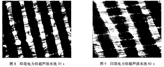 超声波退浆水洗工艺优于常规水洗工艺,超声波退浆水洗时间比常规水洗至少省时1/3,在水洗温度较低的情况下就能达到常规工艺高温水洗时的效果。因此利用超声波进行印花织物的退浆水洗能有效提高水洗效率,节能减耗。